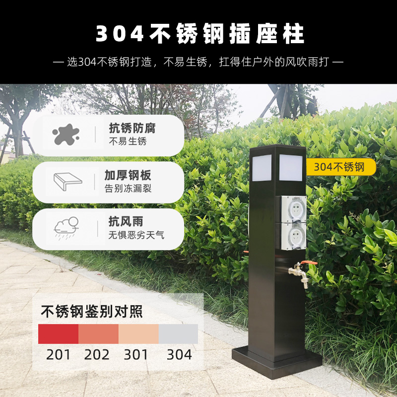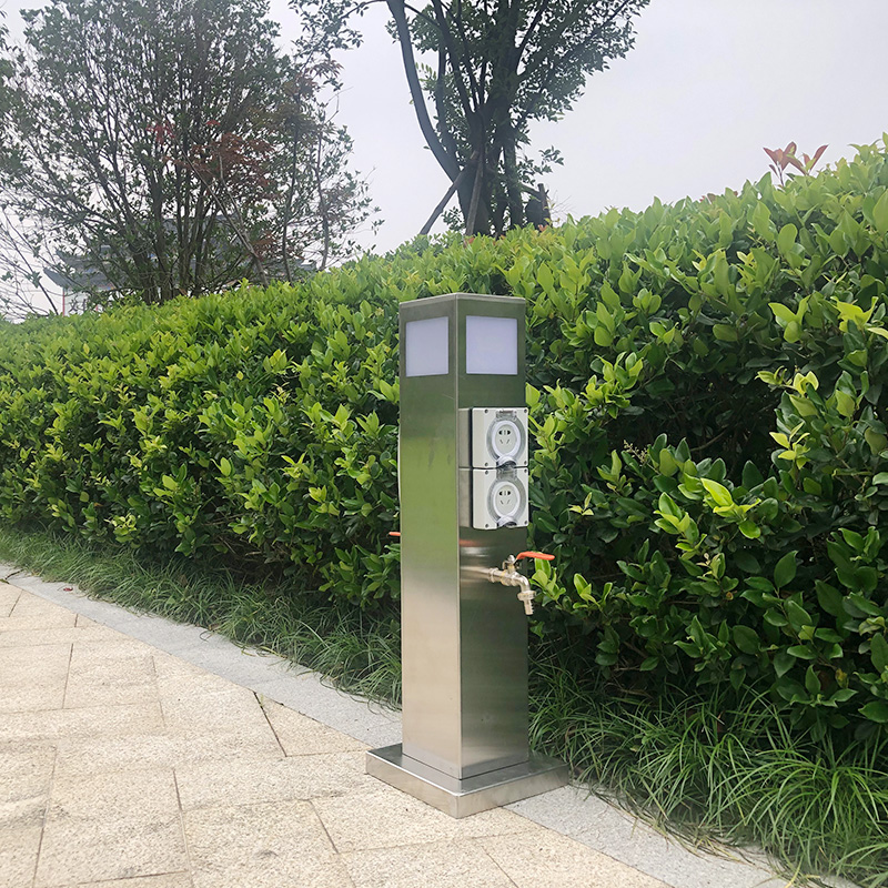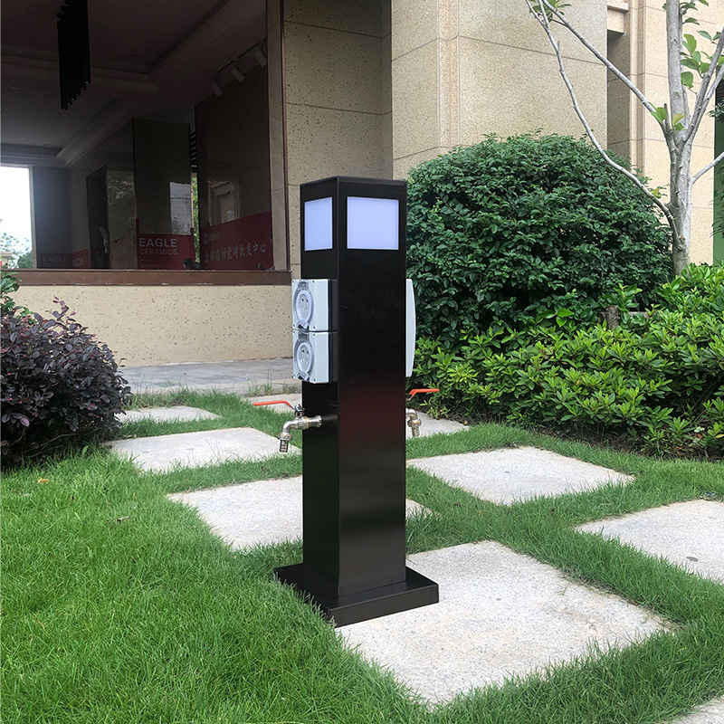 庭院帶燈水電樁GRWE801515D-R系列水電樁,IP66防護標準,無懼風雨沙塵,長久穩定運行。配備漏電保護器,智能三合一防護,漏電0.1秒斷電。PC硅膠燈板加持,歐普LED更耐用,光照持久穩定。