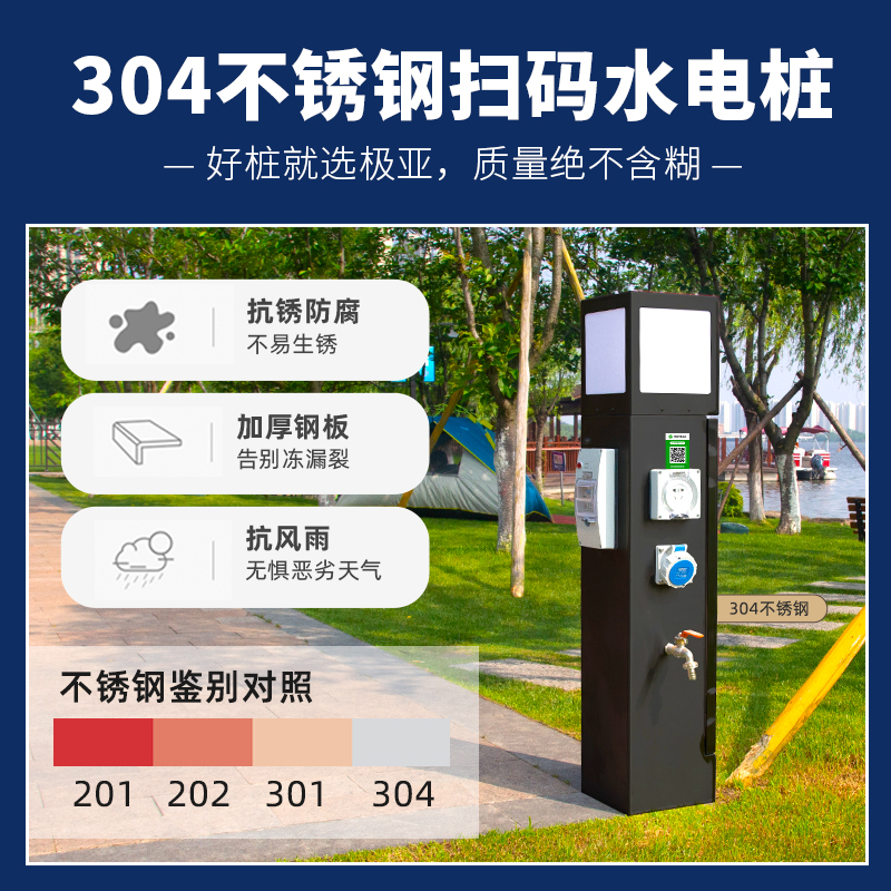 房車營地水電樁GRWE801520D-A樁體采用304不銹鋼材質自修復氧化膜,防水防銹更持久。IP66認證,密封防塵防水,戶外使用更可靠。4G智能掃碼支付,生意流水隨時查,經營決策更精準。