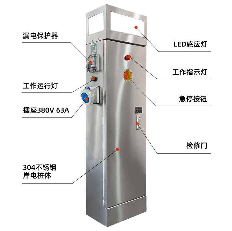老國標岸電樁GRSW-220V-7kw-D-R系列采用304不銹鋼,防銹耐腐蝕性能出眾,使用壽命遠超普通材質。智能三合一防護,漏電0.1秒斷電。同時配備4G掃碼智付功能,財務管理更輕松。